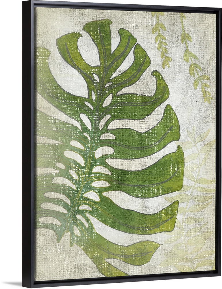 <p>Vertical decor with an illustrated palm leaf on a textured neutral colored background.</p>