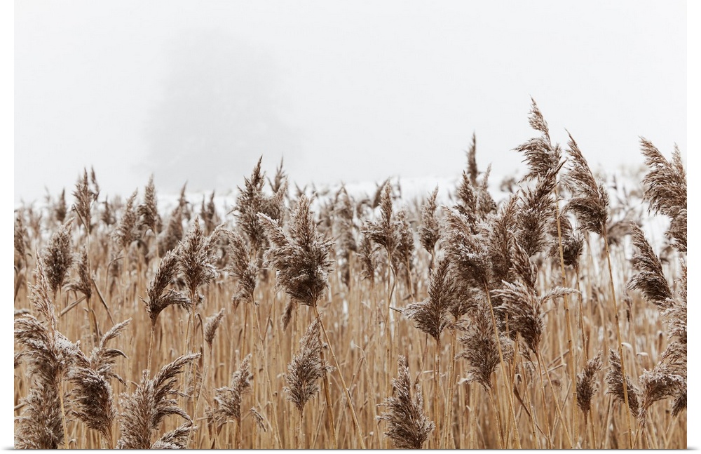 <p>Frost-covered reeds, beside the estuary of the river exe, Powderham, Starcross, Devon, Great Britain, England.</p>