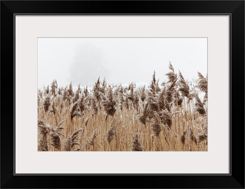 <p>Frost-covered reeds, beside the estuary of the river exe, Powderham, Starcross, Devon, Great Britain, England.</p>