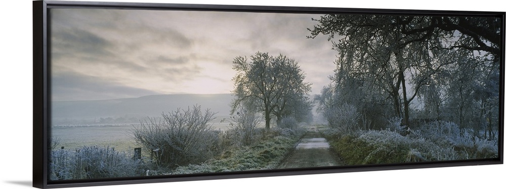 <p>Horizontal photograph on a big canvas of a narrow road running through a wooded area covered in frost, as the sun rises on the horizon in North Yorkshire, England.</p>