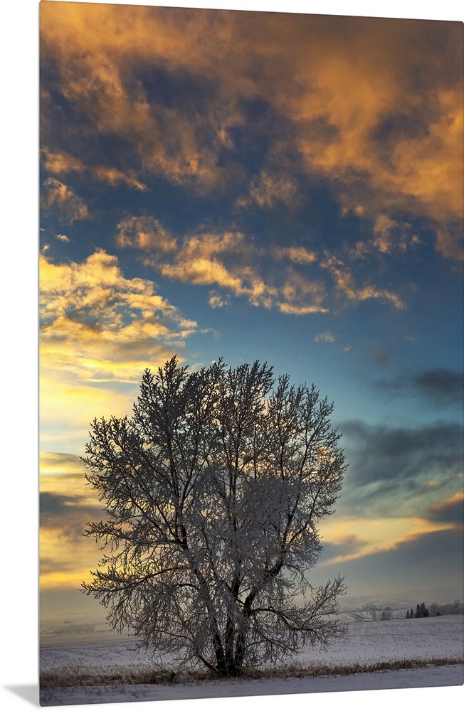 <p>Frosted tree in snow-covered field at sunset with colourful clouds and blue sky; Alberta, Canada</p>