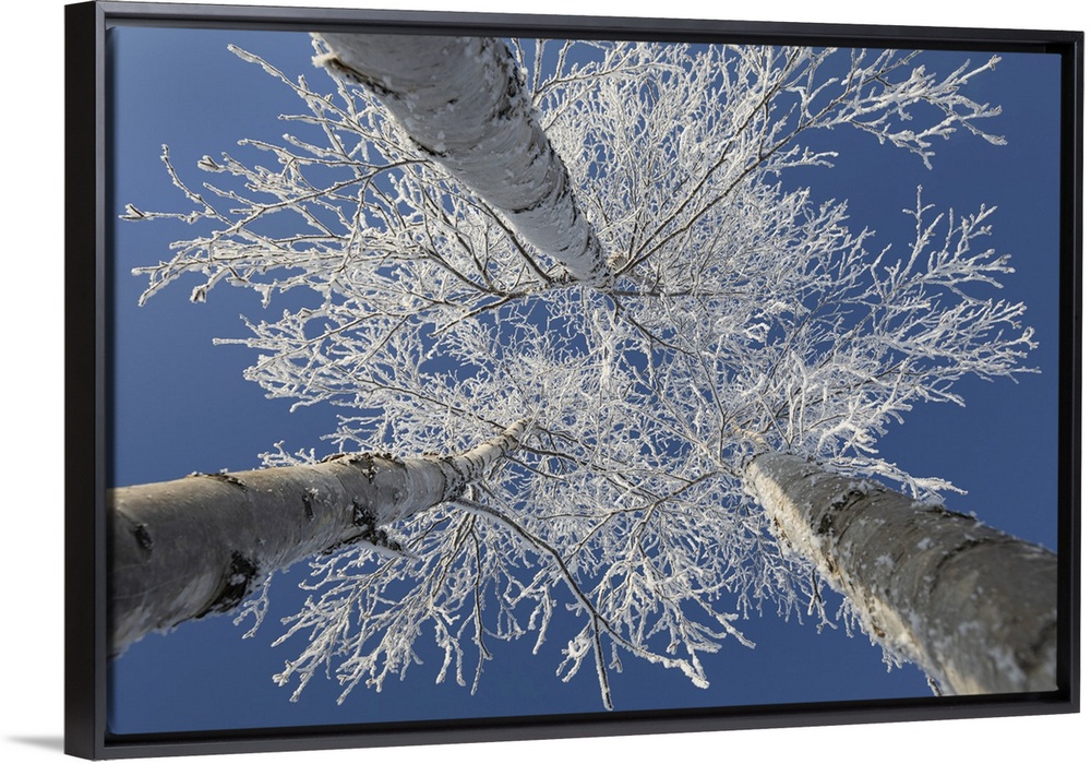 <p>Frosty covered birch tree reaching up to clear blue sky, Thunder Bay, Ontario, Canada</p>