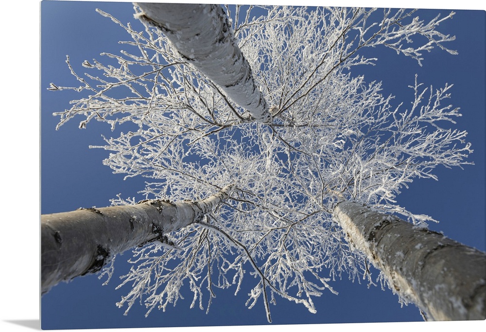 <p>Frosty covered birch tree reaching up to clear blue sky, Thunder Bay, Ontario, Canada</p>