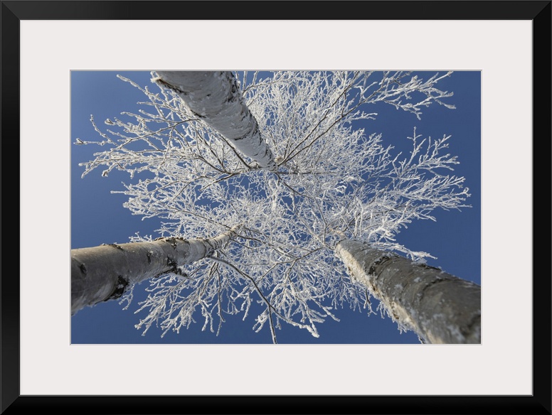 <p>Frosty covered birch tree reaching up to clear blue sky, Thunder Bay, Ontario, Canada</p>