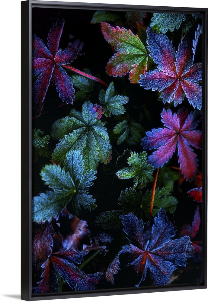<p>Iridescent leaves tinged with frost glowing in the dark.</p>
