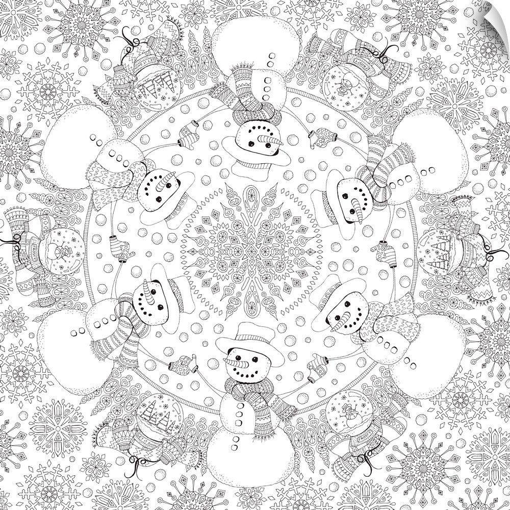<p>Black and white line art of a Winter themed mandala made out of snowmen, snowflakes, and snow globes.</p>