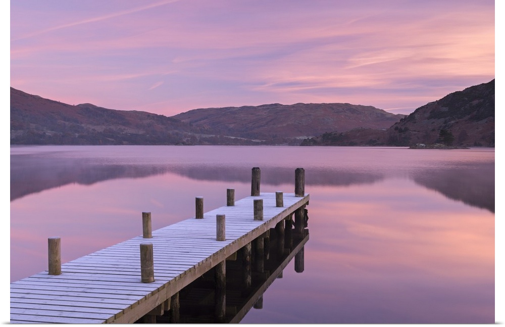 <p>Frosty wooden jetty on Ullswater at dawn, Lake District, Cumbria, England. Winter (November)</p>