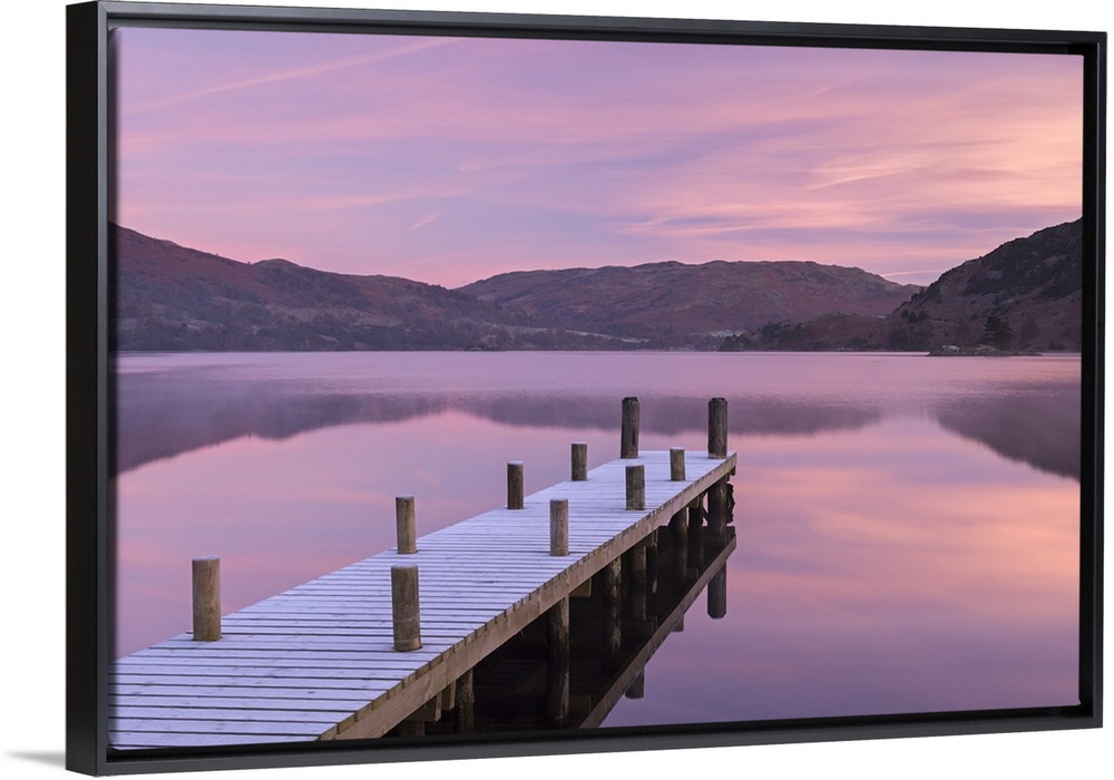 <p>Frosty wooden jetty on Ullswater at dawn, Lake District, Cumbria, England. Winter (November)</p>