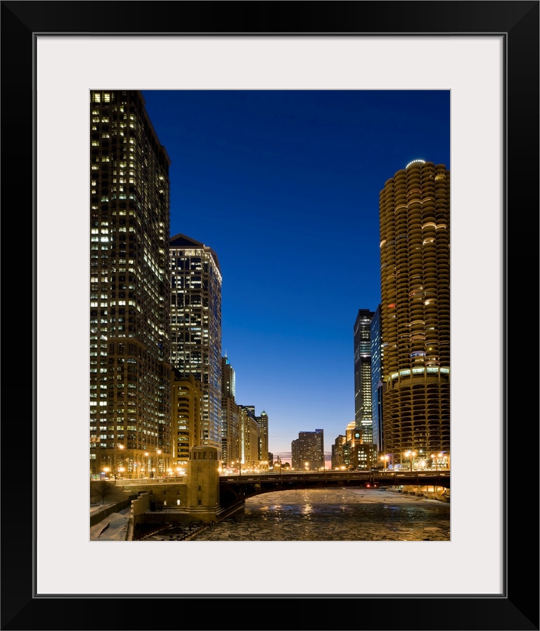 <p>Looking down the frozen Chicago River at dusk.</p>