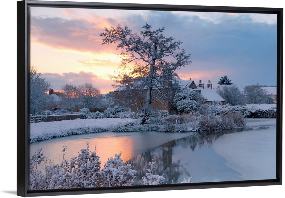 <p>A golden dawn over a village pond and snowy fields to the village roofs beyond with trees in snow, Nottinghamshire, UK.</p>