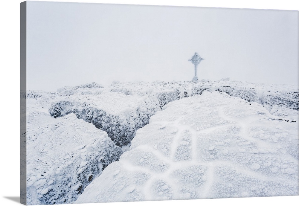<p>Frozen ice formations on the summit of Galtymor mountain with a celtic cross in winter, Galty Mountains; County Tipperary, Ireland.</p>