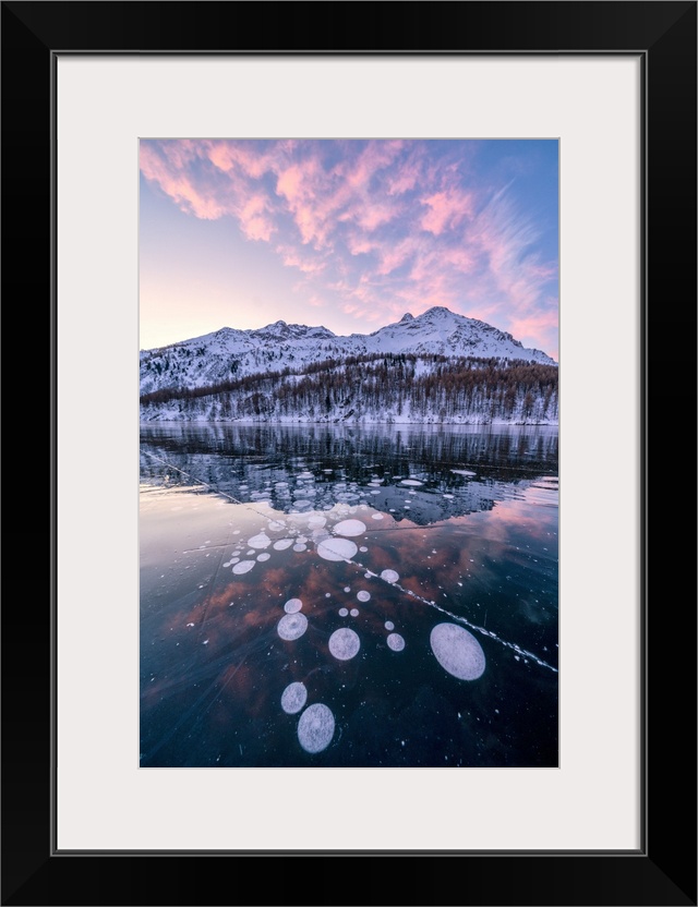 <p>Frozen Lake Sils at sunrise with Piz Da La Margna in background, Engadine, canton of Graubunden, Switzerland, Europe</p>
