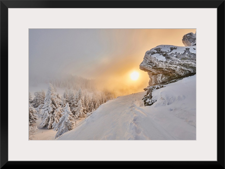 <p>Frozen Norway spruce or European spruce (Picea abies) tree at sunrise on Mount Arber in the Bavarian Forest, Bavaria, Germany</p>