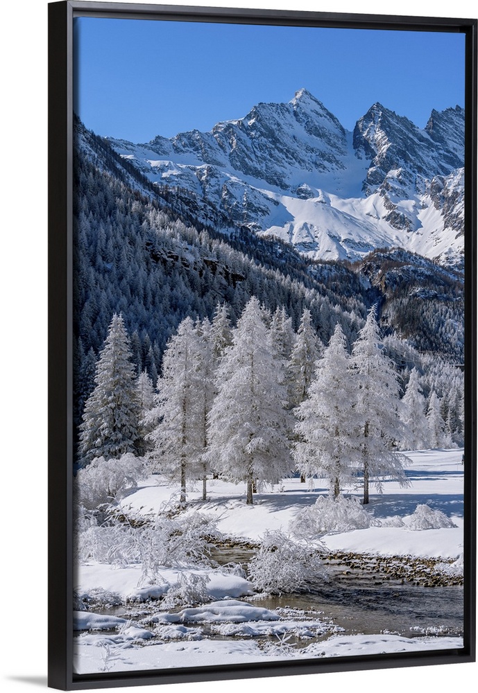 <p>Frozen trees with river on Ceresole Reale, Levanne on background, Orco Valley, Piedmont, Italy, Europe. Piedmont, Western Europe, Italy.</p>