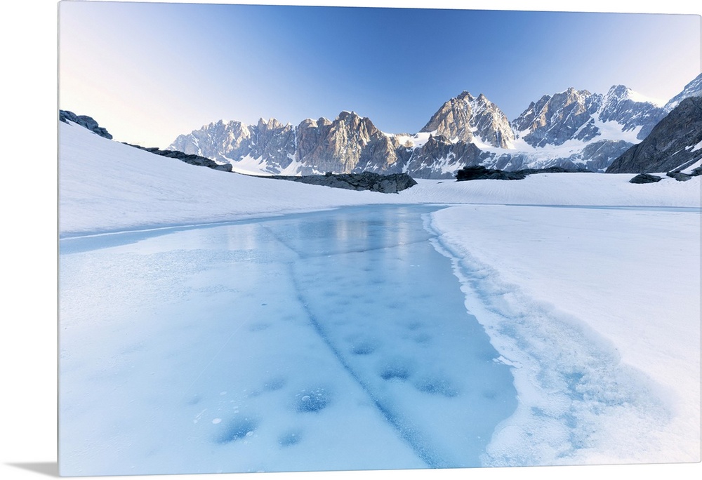 <p>Frozen water of Forbici Lake during the spring thaw, Valmalenco, Valtellina, Sondrio province, Lombardy, Italy, Europe</p>