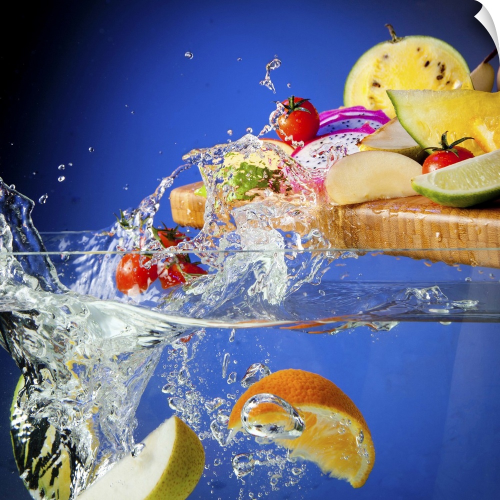 <p>Fresh assorted Fruits on a chopping board splashing in a tank of water</p>