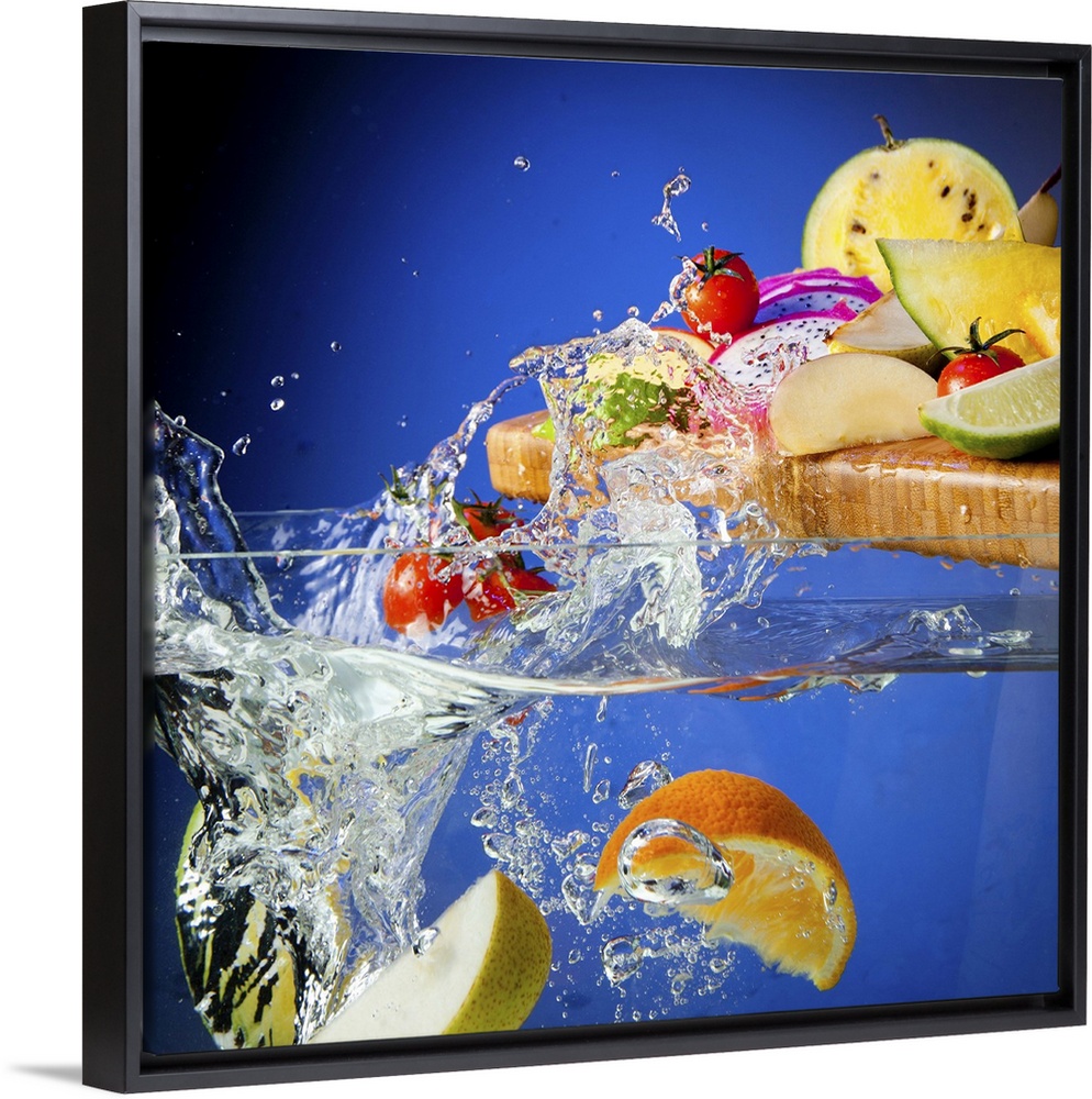 <p>Fresh assorted Fruits on a chopping board splashing in a tank of water</p>