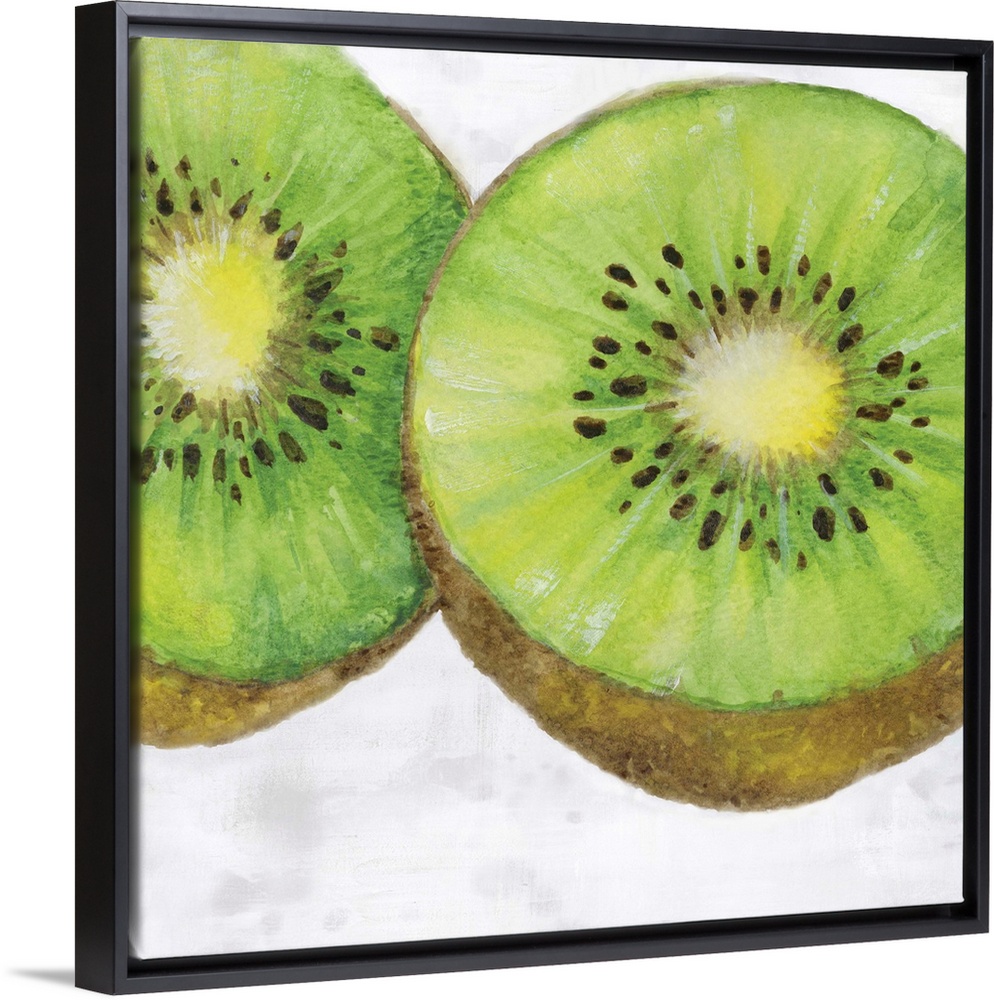 <p>Contemporary watercolor painting of a kiwi split in half on a white and gray square background.</p>