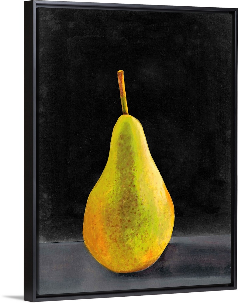 <p>Painting of a single pear sitting on a dark shelf.</p>