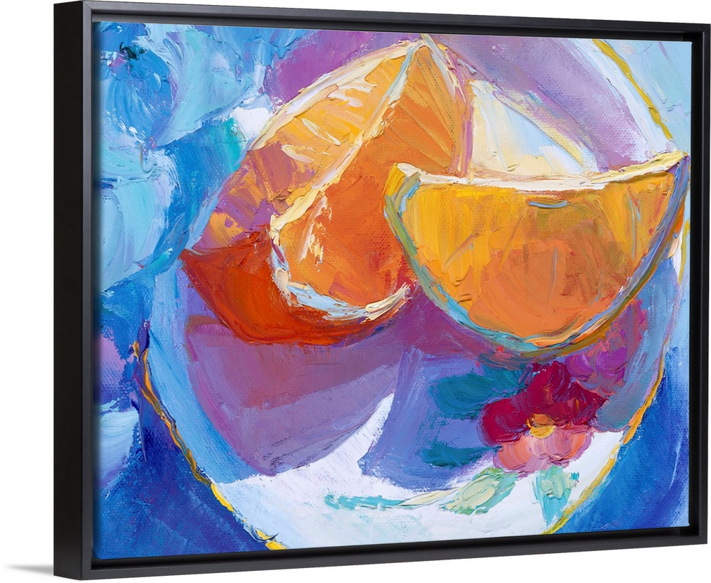 <p>A contemporary painting of orange slices sitting on a plate.</p>