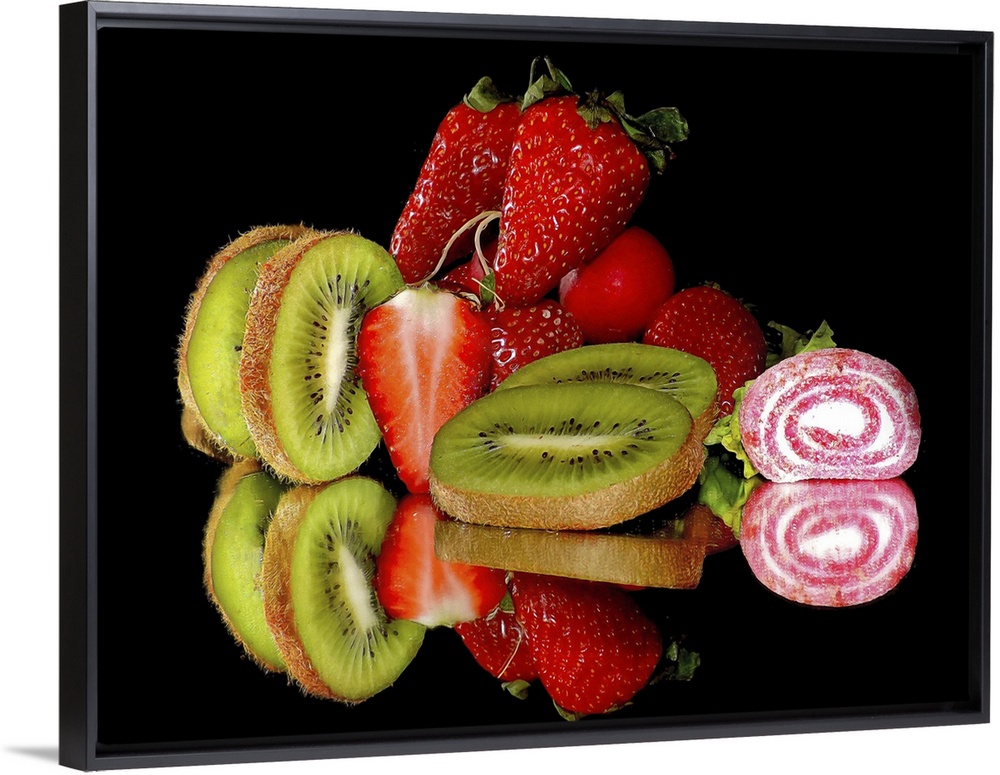 <p>Kiwis, strawberries, and candy on a mirror.</p>