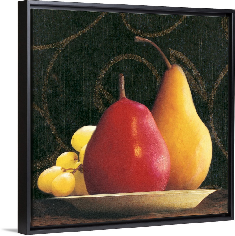 <p>Two pears and a bunch of grapes on a plate with a wallpapered background.</p>