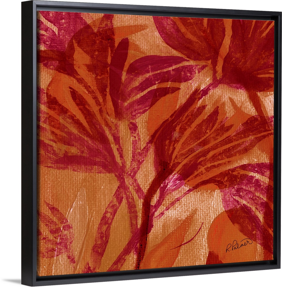 <p>Square decorative painting of pink silhouettes of Fall foliage on an orange background.</p>