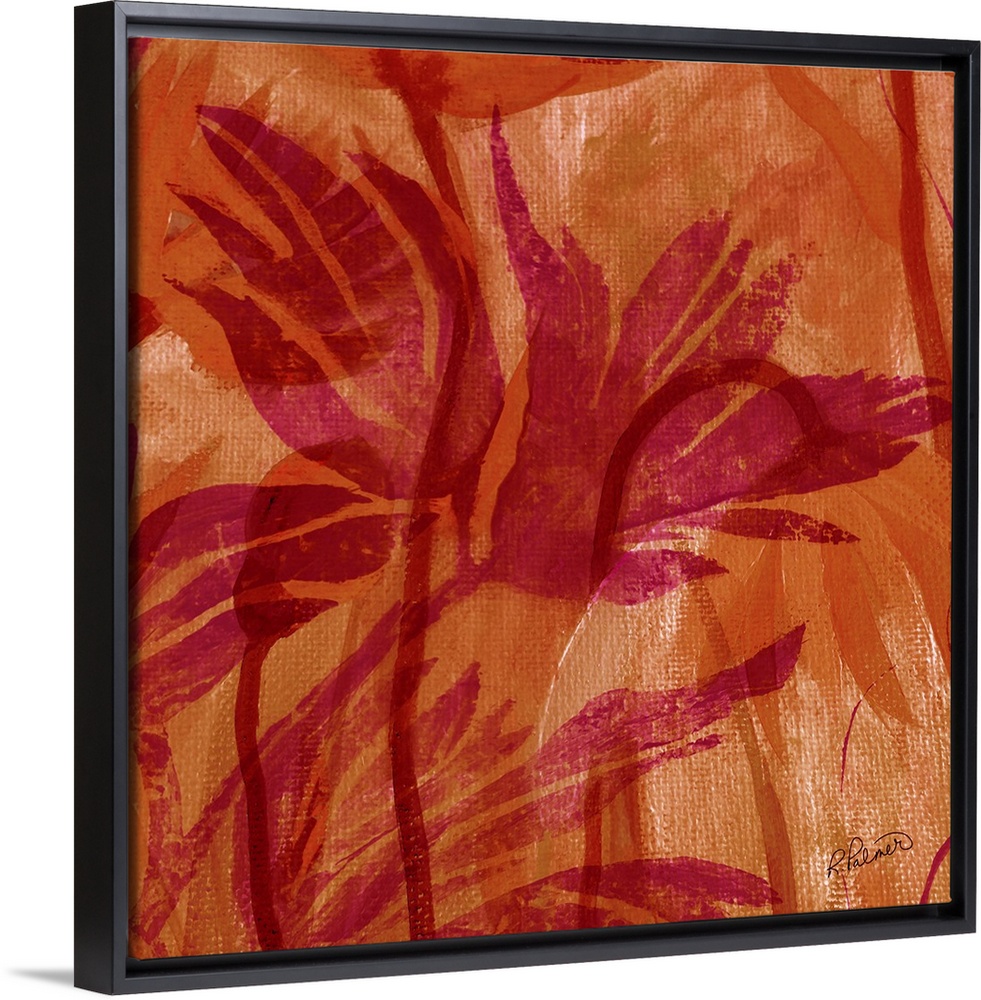 <p>Square decorative painting of pink silhouettes of Fall foliage on an orange background.</p>