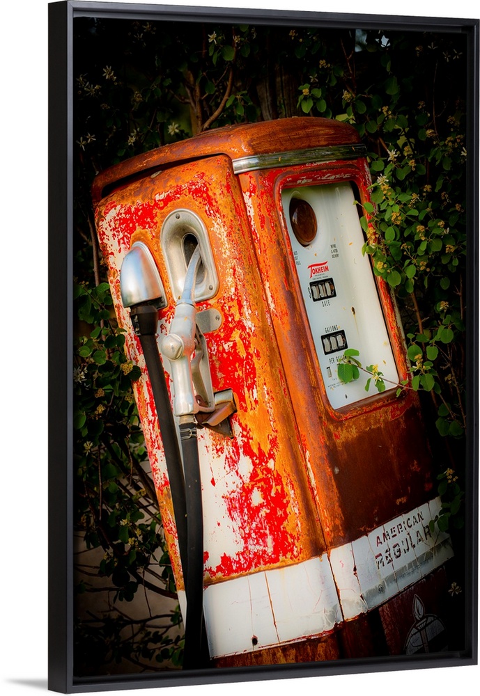 <p>Photograph of a vintage gas pump surrounded by green foliage.</p>