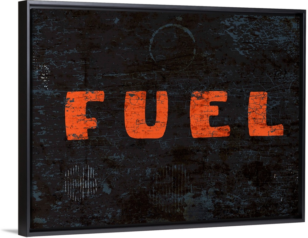 <p>Graphic rusty wall art of distressed typography with the the word FUEL large, in orange, and in center on a black background.</p>
