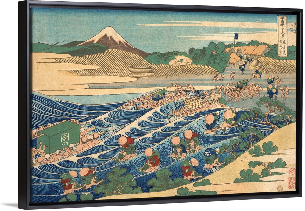 <p>The vibrant, stylized design of this print, particularly the turbulent play of color and line used to compose the river and the travelers crossing it, threatens the integrity of the monochrome mountain beyond. The rhyming and analogizing of form and color that figure so prominently in Hokusai's style are virtually absent from this image of explosive color and line.</p>
