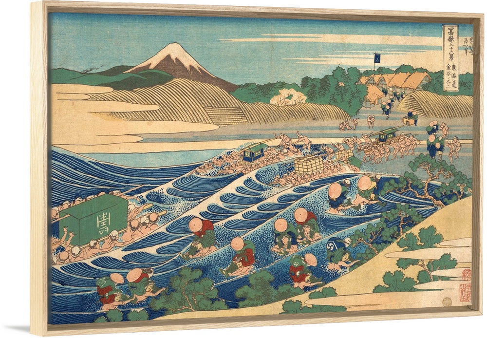<p>The vibrant, stylized design of this print, particularly the turbulent play of color and line used to compose the river and the travelers crossing it, threatens the integrity of the monochrome mountain beyond. The rhyming and analogizing of form and color that figure so prominently in Hokusai's style are virtually absent from this image of explosive color and line.</p>