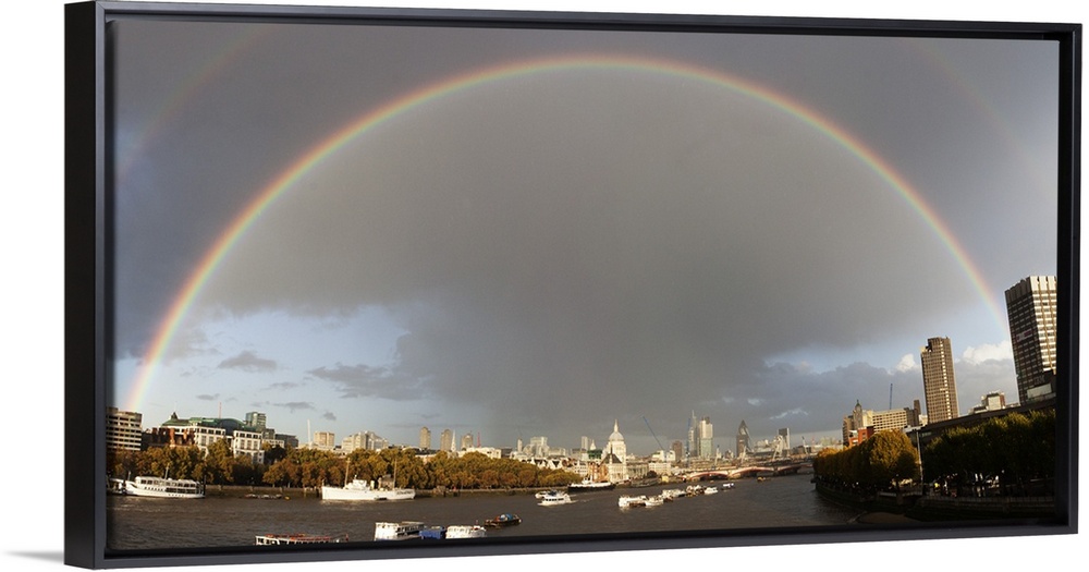 <p>Full arc rainbow, with partial double rainbow in frame, taken from Waterloo Bridge London looking eastwards up River Thames towards sunlit City of London.</p>