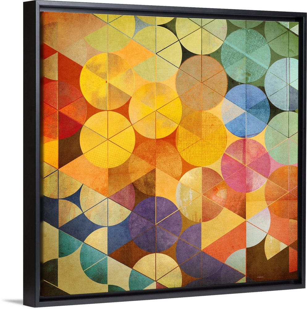 <p>A square abstract of rows of circles with triangle overlays in multiple bright colors.</p>