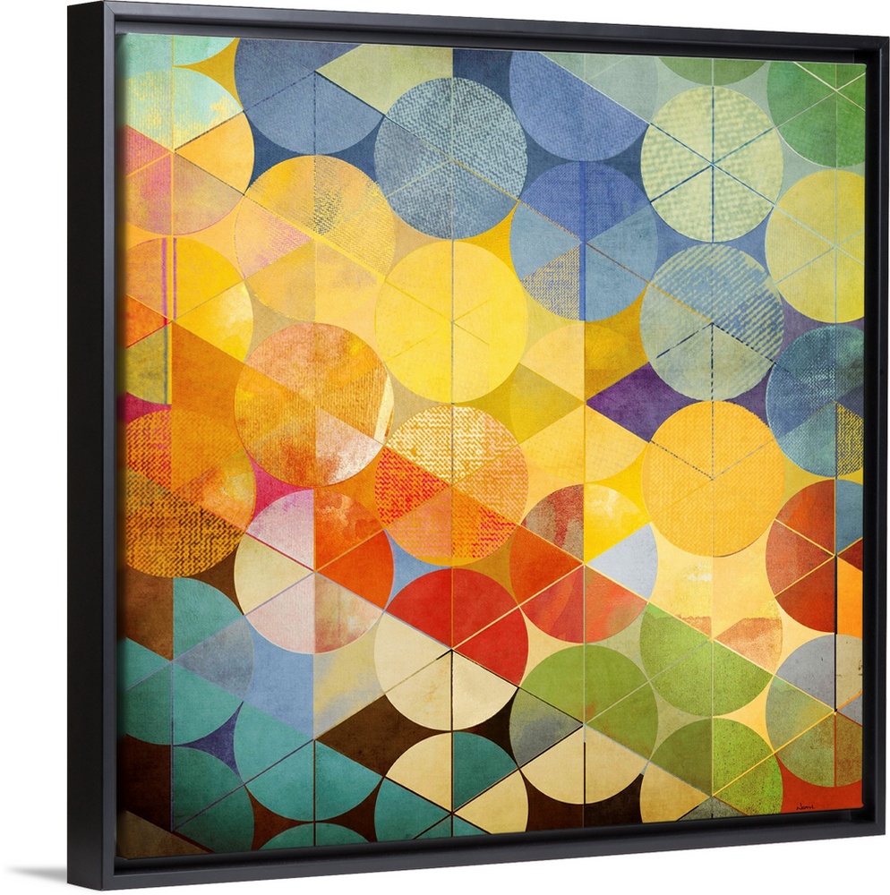 <p>A square abstract of rows of circles with triangle overlays in multiple bright colors.</p>