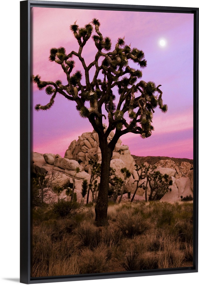 <p>A full moon and a Joshua tree against a pink sky just after sunset. The Real Hidden Valley, Joshua Tree National Park, California.</p>
