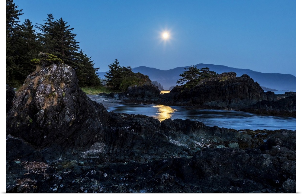 <p>A full moon rises over Nootka Island, Nuchatlitz Provincial Park; British Columbia, Canada</p>