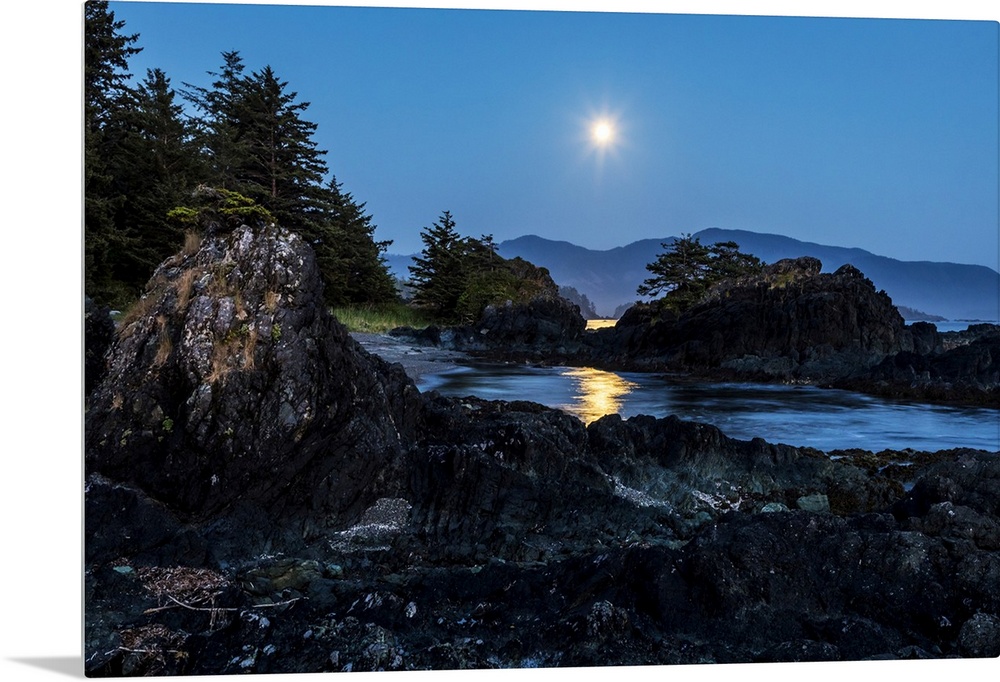 <p>A full moon rises over Nootka Island, Nuchatlitz Provincial Park; British Columbia, Canada</p>