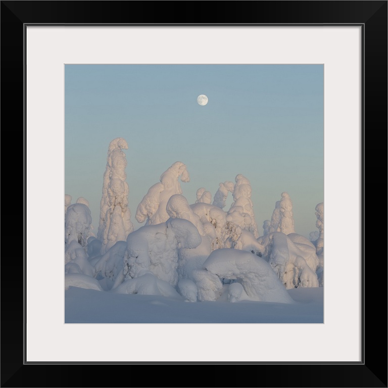 <p>Full moon rising over snow covered winter landscape at twilight, tykky, Kuntivaara Fell, Finland, Europe</p>