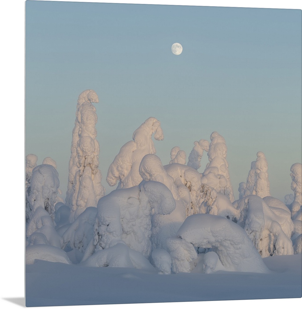<p>Full moon rising over snow covered winter landscape at twilight, tykky, Kuntivaara Fell, Finland, Europe</p>