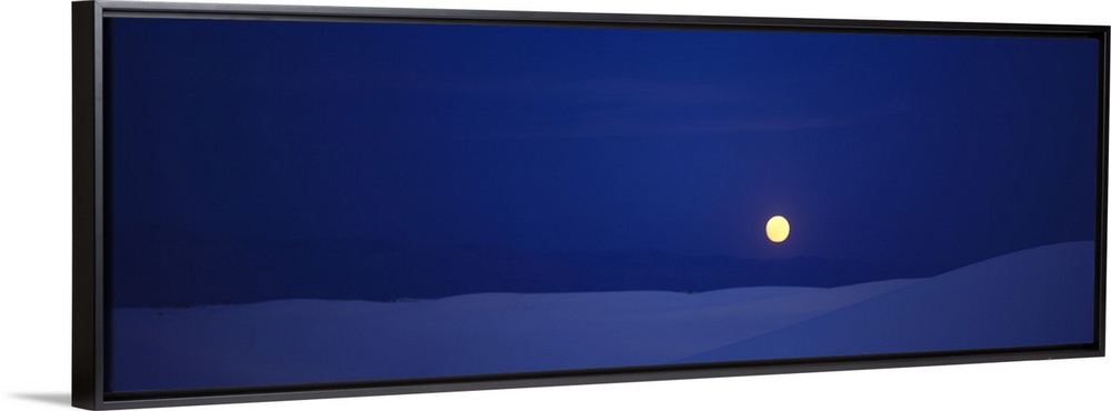 <p>Panoramic photograph taken of a full moon against a deep blue sky and sitting above white sand that is shaded blue.</p>