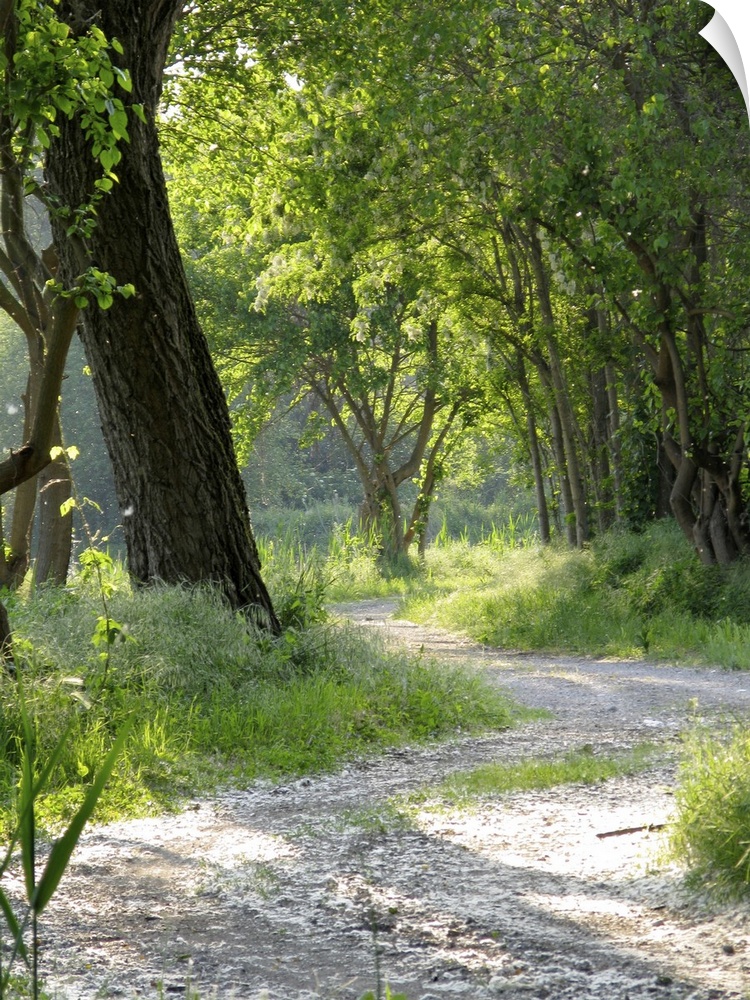 <p>A dusty winding gravel path weaves its way though a woods of green trees.</p>
