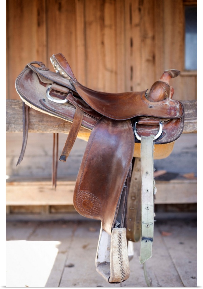 <p>Full view of a Saddle resting on the railing, Tucson, Arizona, United States.</p>