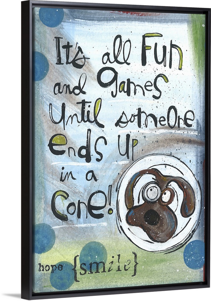 <p>Humorous illustration of a dog in a cone with the phrase "It's all fun and games until someone ends up in a cone!"</p>