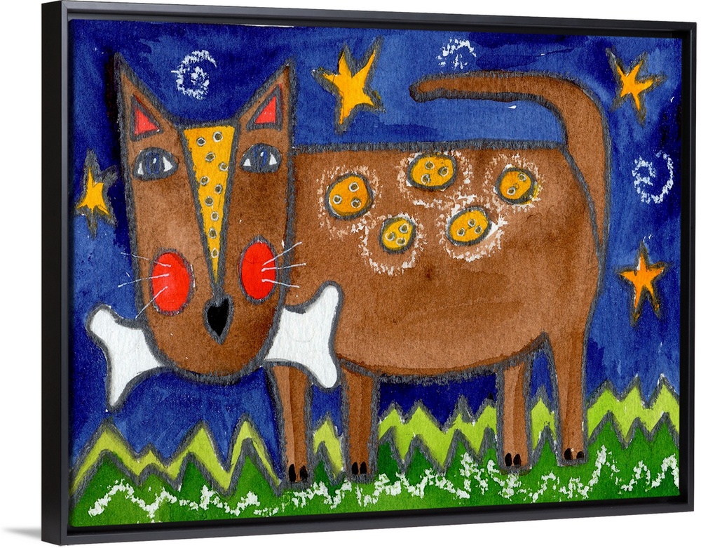 <p>A brown dog holding a large bone under a starry sky.</p>
