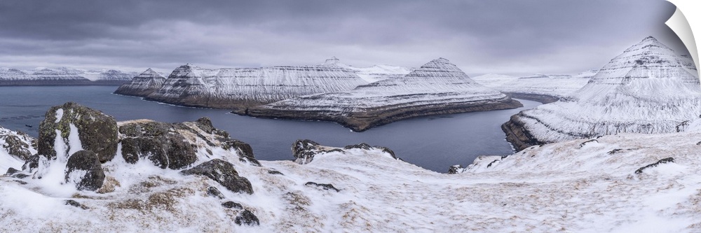 <p>Snow covered mountain scenery above Funningsfjordur on the island of Eysturoy, Faroe Islands, Denmark, Europe. Winter (April) 2015.</p>