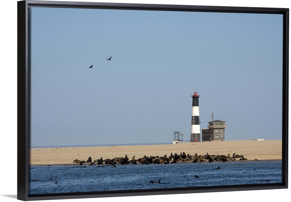 <p>Colony of fur seals - Arctocephalus australis - sleeping and relaxing on the sand at Pelican Point with the sea in the foreground, a lighthouse in the background and with two cormorants in the blue sky near Sandwich Harbour, Parc National du Namib-Naukluff, Namibia.</p>