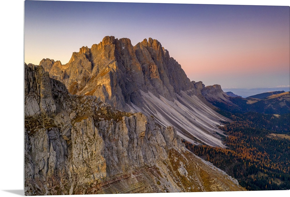 <p>Autumn trees at feet of Furchetta and Sass Rigais, aerial view, Puez-Odle, Funes Valley, Dolomites, Bolzano, South Tyrol, Italy, Europe</p>