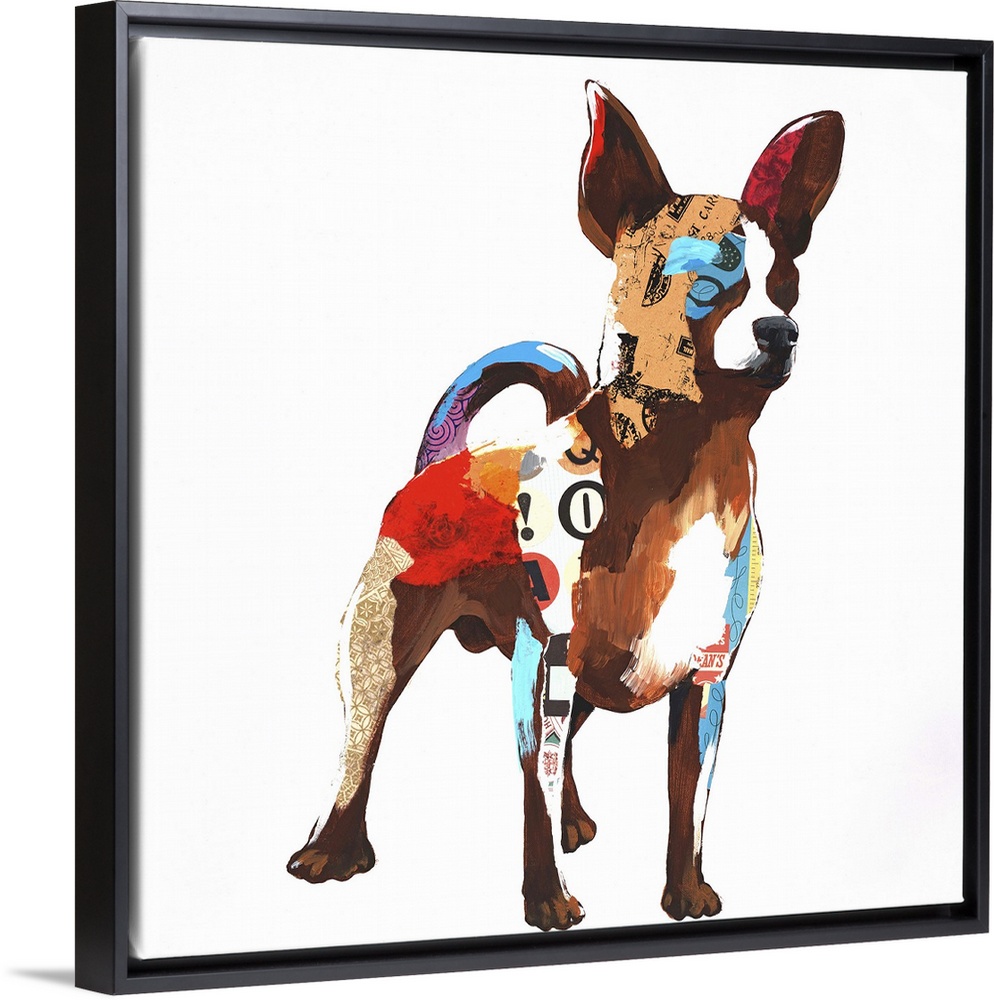 <p>Square art created with mixed media of a colorful chihuahua on a white background.</p>