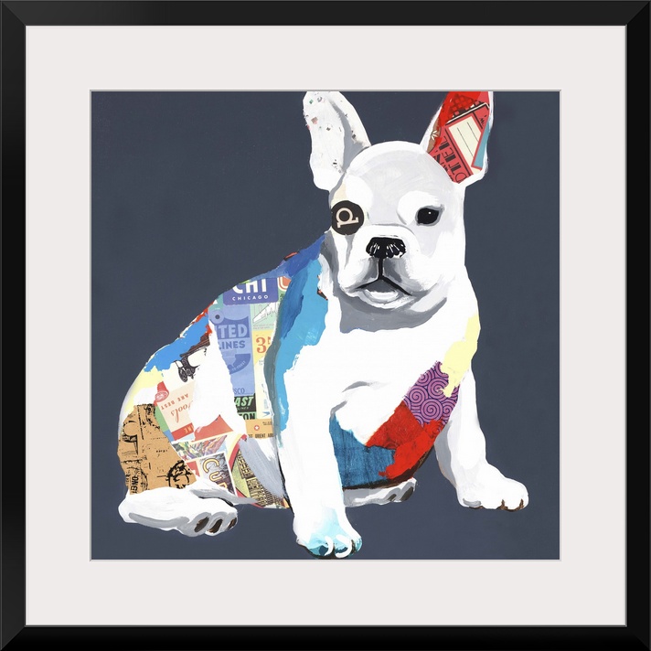 <p>Square art created with mixed media of a colorful dog on a dark blue background.</p>